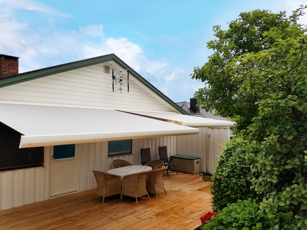 En kassettmarkise (der armer og duk trekkes inn i en lukket kasse) er langt bedre egnet for Bergen enn en åpen markise. Fordeler med kassett: